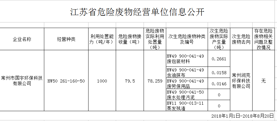 常州市國宇環(huán)保科技有限公司江蘇省危險廢物經(jīng)營單位信息公開